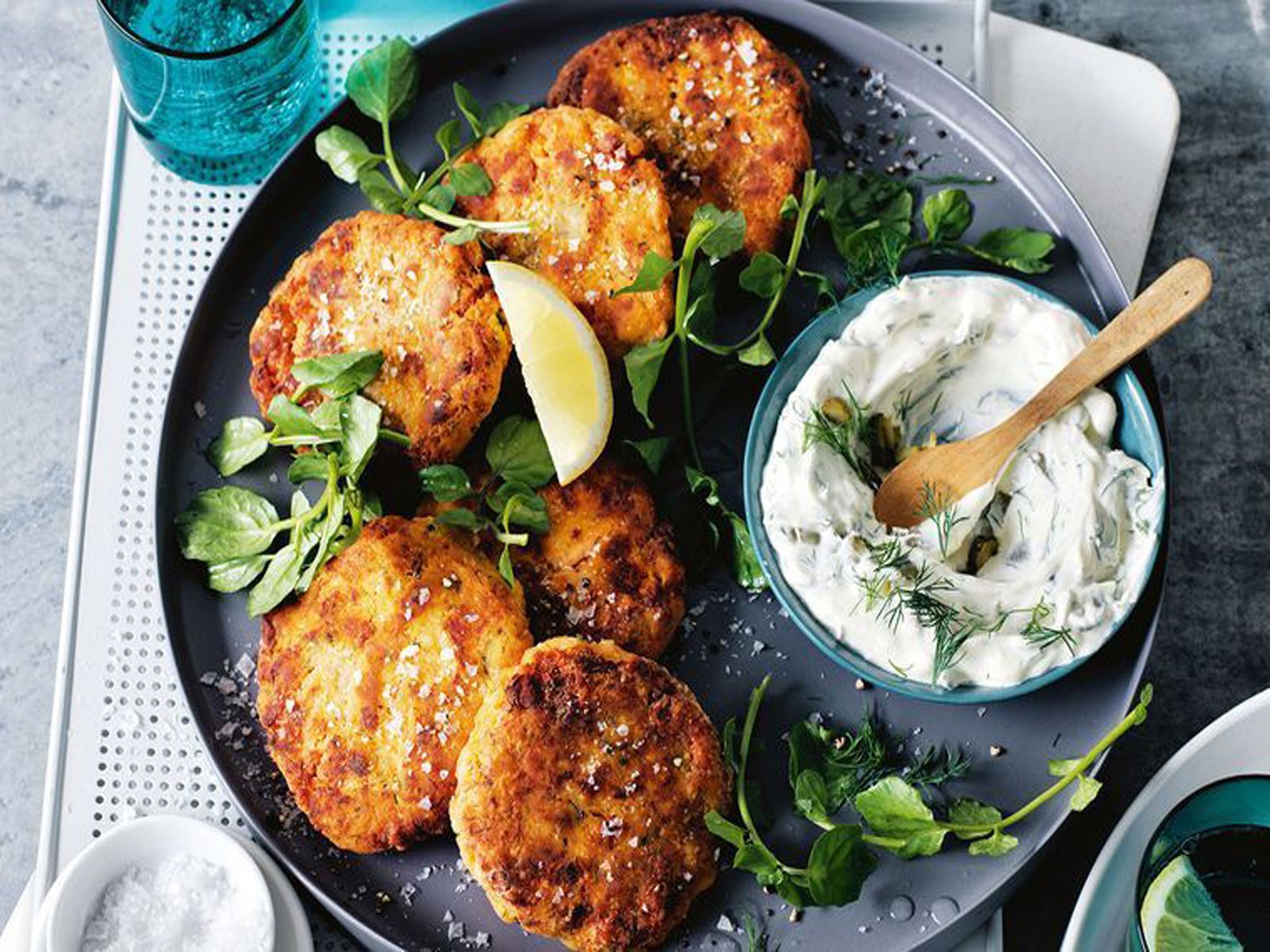 4 – Kalan ekşi kremayı limon suyu, cornichons ve kalan dereotu ile bir kapta birleştirin. Mevsim. Dereotu ekşi krema, su teresi ve limon dilimleri ile balık köftesi servis yapın.